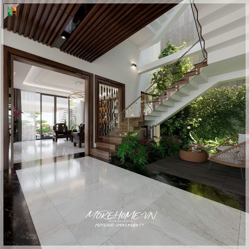 Thi công nội thất nhà phố, biệt thự hiện đại không gian xanh mát của cây cảnh, hoa lá là nơi thích hợp để thư giãn, trò chuyện người thân, bạn bè, nhâm nhi ly trà tận hưởng bầu không khí trong lành mát mẻ