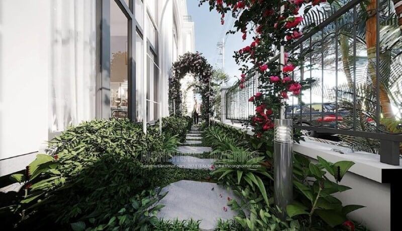 Khoảng sân trước nhà rộng rãi kết nối cổng với biệt thự, mang lại cảm giác thoải mái và hấp dẫn.